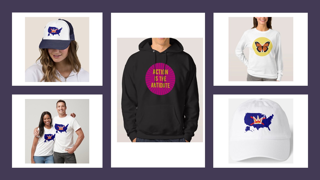Our amazing in-house designer Jenna has created a Zazzle shop where we can order t-shirts, tote bags, car flags, hats, and more with designs unique to us! Let us know what else you’d like to see. Think: “Use Your Outside Voice”, “Hate Has No Place Here”, etc. We ordered some test shirts and they seem to run true to size, are good quality, medium-weight fabric, and the printing is high quality. Check out the shop and let us know what you think.