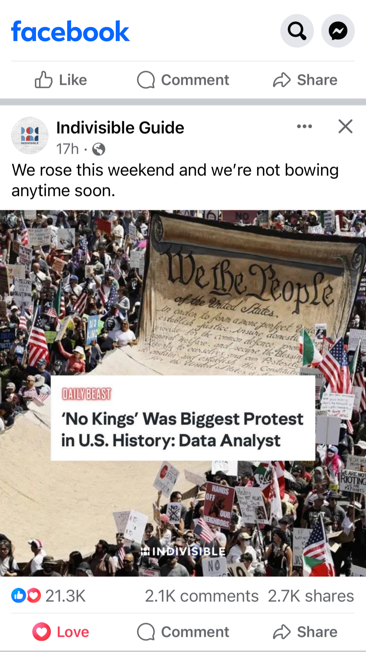 From one of the largest days of protest in US history, to the daily act of organizing in every congressional district in this country, Indivisibles are standing up against authoritarianism. Indivisible National, in partnership with many other organizations, is calling for a MASSIVE protest to show that America has no king and the power belongs to the people. This will be an exciting, powerful day to push back against the authoritarian grab by Trump and crew. Show up and bring a friend!